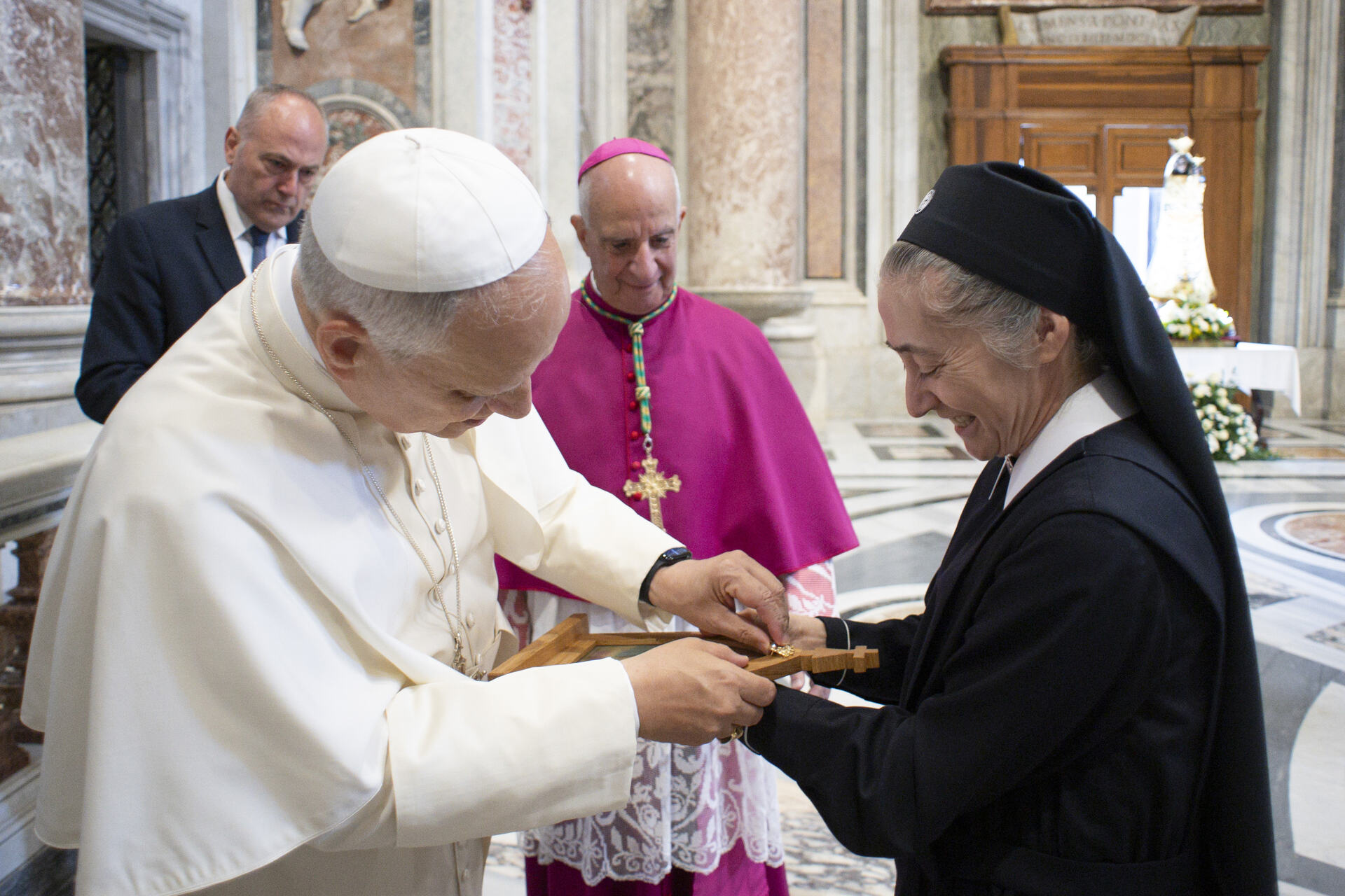 Fr. Pablo Perez, director of the Schoenstatt Movement in Italy, and I, Sr. M. Julia de Almeida, had the grace of greeting the Holy Father, Leo XIV, before Holy Mass. As a sign of our affection for him, on behalf of our entire Schoenstatt Family, Fr. Pablo presented him with a Unity Cross, and I brought a Pilgrim MTA and a crown to be blessed.
