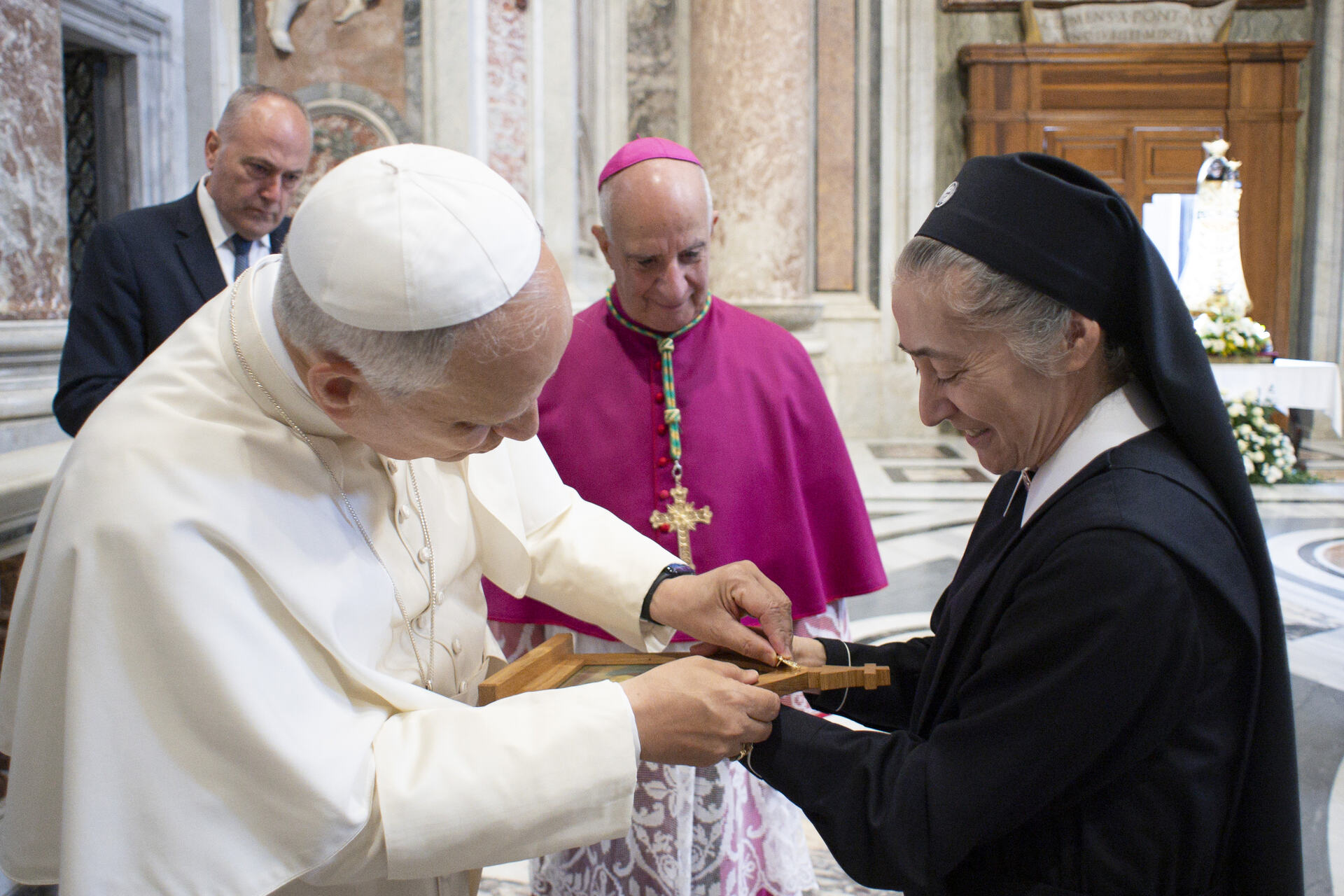 Fr. Pablo Perez and Sr. M. Julia de Almeida had the opportunity to meet with the Holy Father at the closing of the Jubilee of Marian Movements, and the Pope crowned the image of the Pilgrim Mother. Sr. M. Julia recounts: