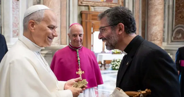 Fr. Pablo Perez, director of the Schoenstatt Movement in Italy, and I, Sr. M. Julia de Almeida, had the grace of greeting the Holy Father, Leo XIV, before Holy Mass. As a sign of our affection for him, on behalf of our entire Schoenstatt Family, Fr. Pablo presented him with a Unity Cross, and I brought a Pilgrim MTA and a crown to be blessed.