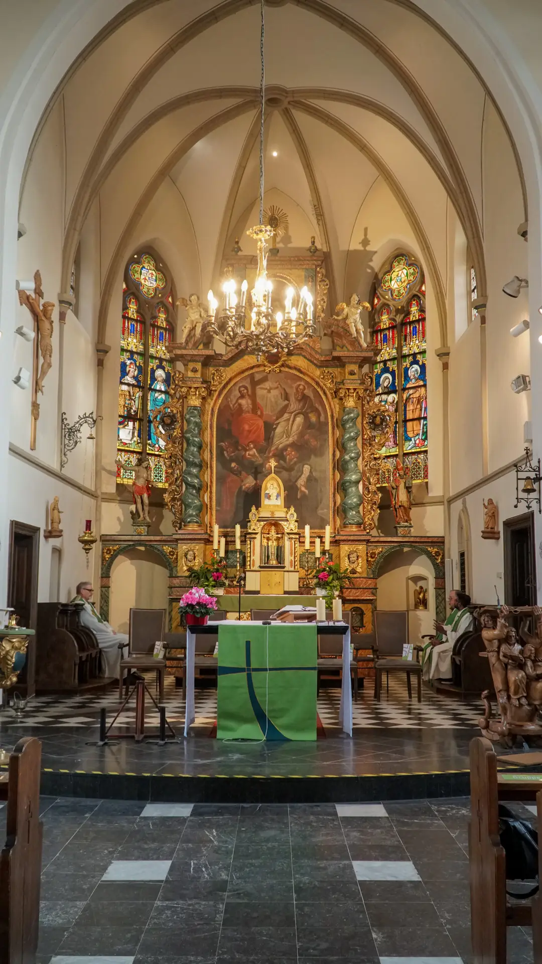 On Sunday morning, in addition to the parishioners of the local parish, members of the Schoenstatt Family from the surrounding area and other regions gathered there to attend the festive Mass in the parish of St. Cuniberto. A group of Brazilians who had arrived by bus was also present. It was a joy to welcome the Archbishop of Cambrai (France), Monsignor Vincent Dollmann, who accepted the invitation to preside over the celebration. Among the concelebrants were Father Hans-Peter Kippels, parish priest of the Pastoral Region of Erftstadt; Father Joseph Pikos, parish vicar of Gymnich; and several Schönstatt priests and chaplains from different countries. In the entrance procession, they were accompanied by a delegation from the local shooting associations. The Neue Wege (New Ways) choir, conducted by Johannes Speckamp, enlivened the Holy Mass with joyful songs that expressed the joy of faith.