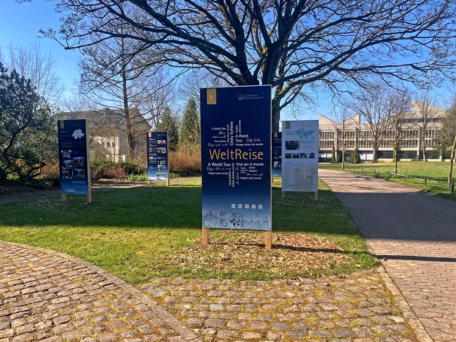 Die Reise ins Heute – WELTREISE – lädt in den Outdoor-Bereich zwischen Mutterhaus und der Dreifaltigkeitskirche ein: Auf 20 großformatigen Tafeln wird sichtbar, wie vielfältig die Gemeinschaft heute weltweit wirkt – in Bildung, Seelsorge, Sozialprojekten und vielem mehr.