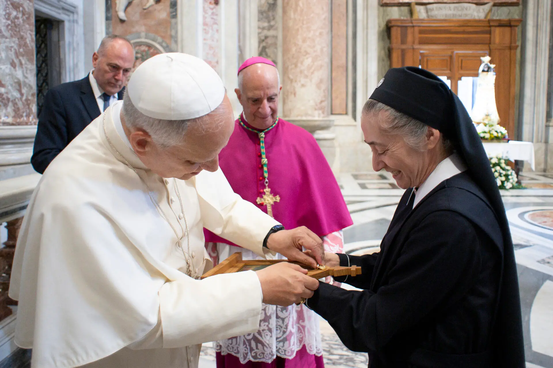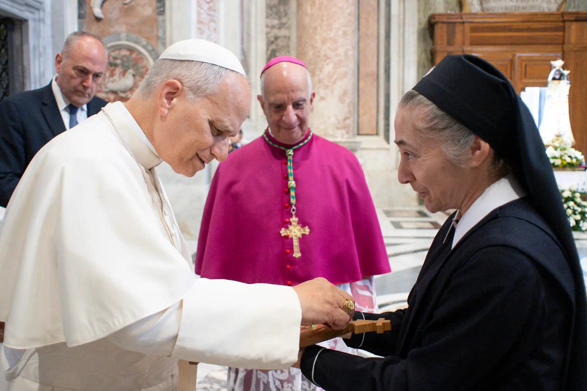 El P. Pablo Pérez, director del Movimiento de Schoenstatt en Italia, y yo, la Hna. M. Julia de Almeida, tuvimos la gracia de saludar al Santo Padre León XIV antes de la Santa Misa. Como muestra de nuestro cariño, el P. Pablo le obsequió una Cruz de la Unidad en nombre de toda nuestra Familia de Schoenstatt, y yo llevé una imagen peregrina y una corona para que las bendijera.