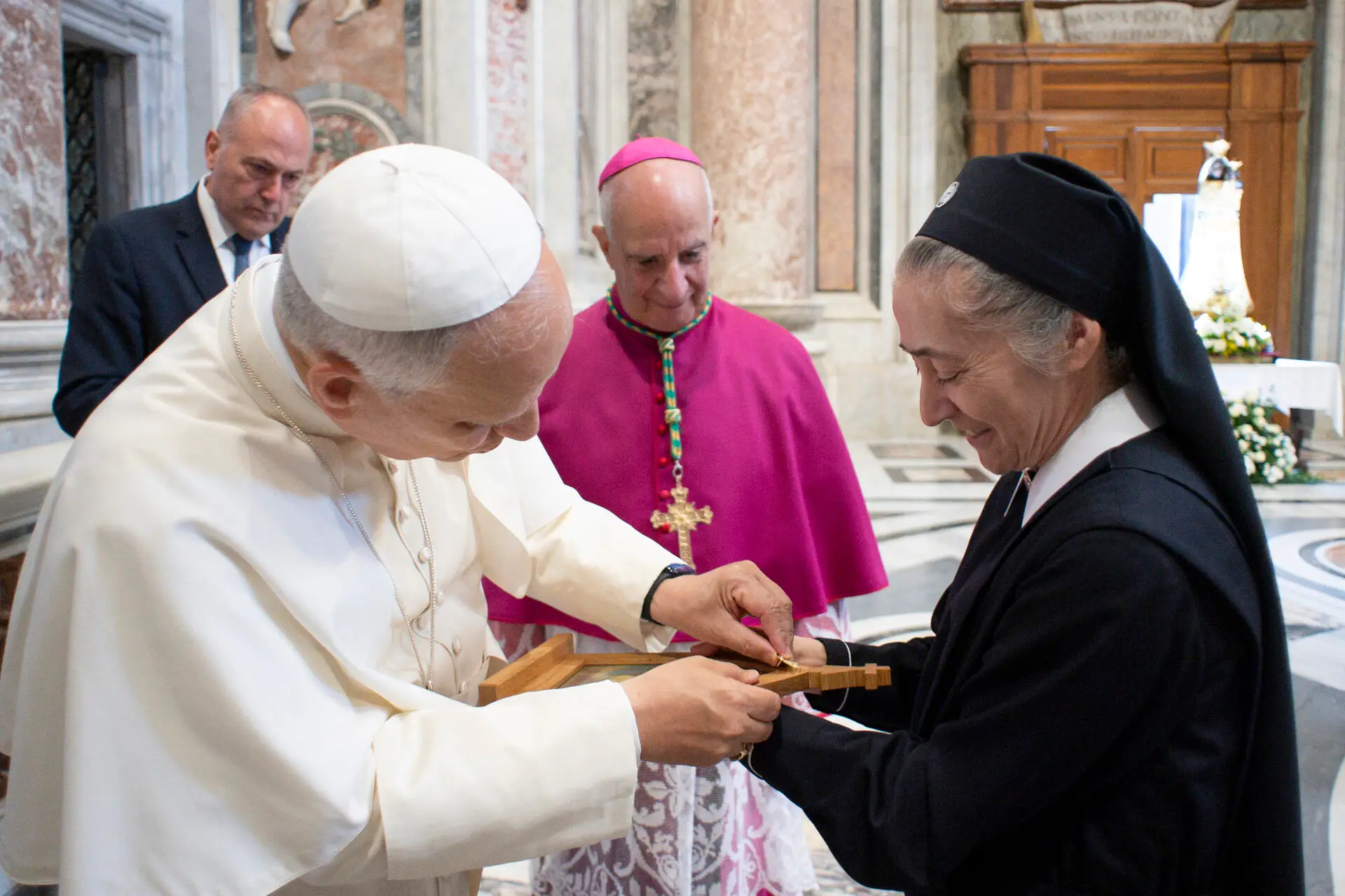 El Santo Padre me escuchó con mucha atención y luego, con devoción, tomó la corona y la colocó sobre la imagen peregrina. Le llevó un poco de tiempo hasta que la corona entró en los dos pequeños agujeros. Primero fue en un agujero y luego en el otro. Después de eso, le dije: «Funcionó, Santidad», y le extendí la imagen. Él la miró con serenidad, sonrió, y entonces le di las gracias.
