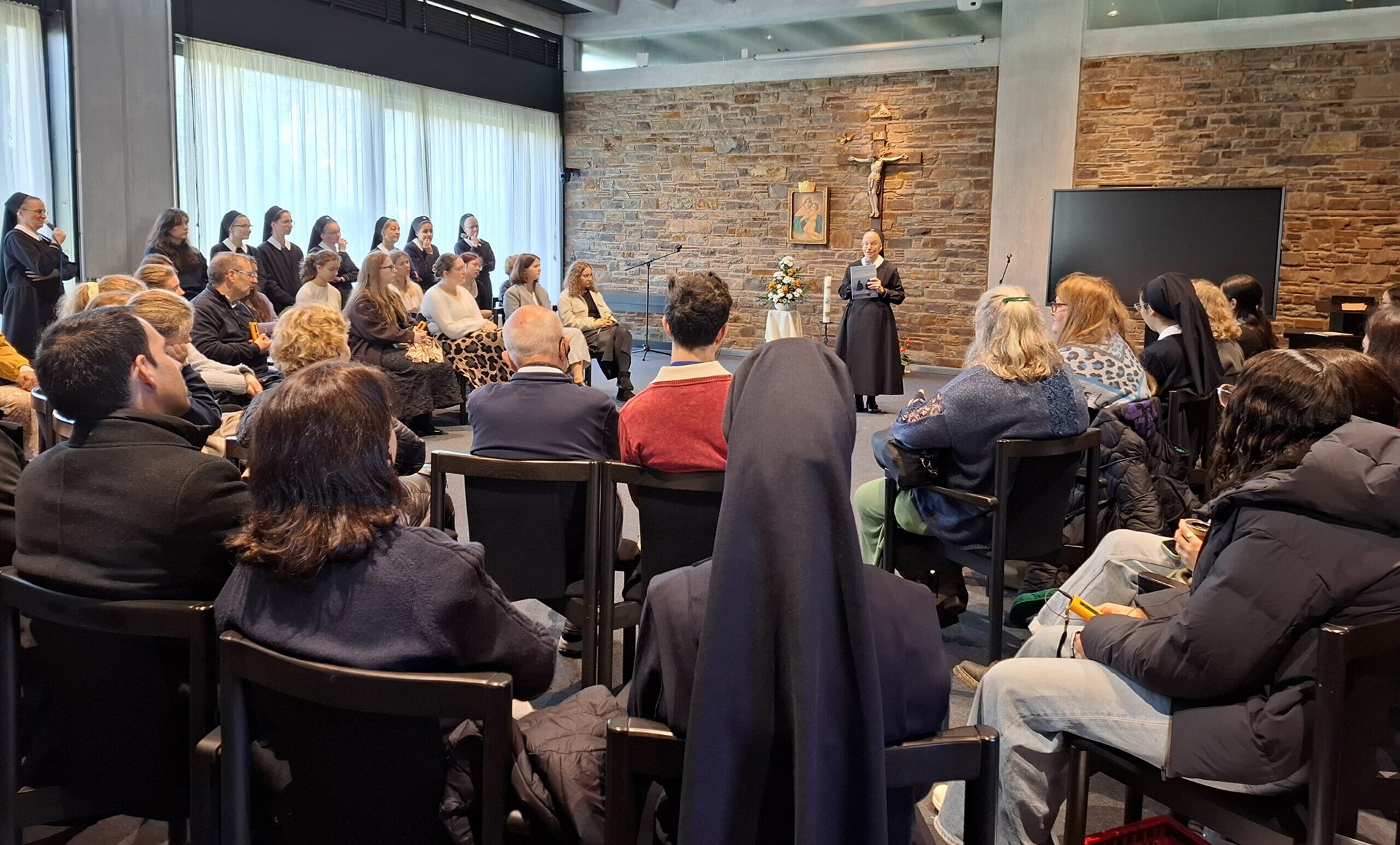 Al día siguiente se celebró la Misa dominical en la iglesia de la Adoración, que también marcó el 140.º cumpleaños del Padre Kentenich. Tras la Misa, tuvo lugar un encuentro en la Casa Madre de las Hermanas para intercambiar experiencias sobre la vocación, la comunidad y el futuro. La vestición de diez novicias en el Año Jubilar fue considerada un regalo especial.
