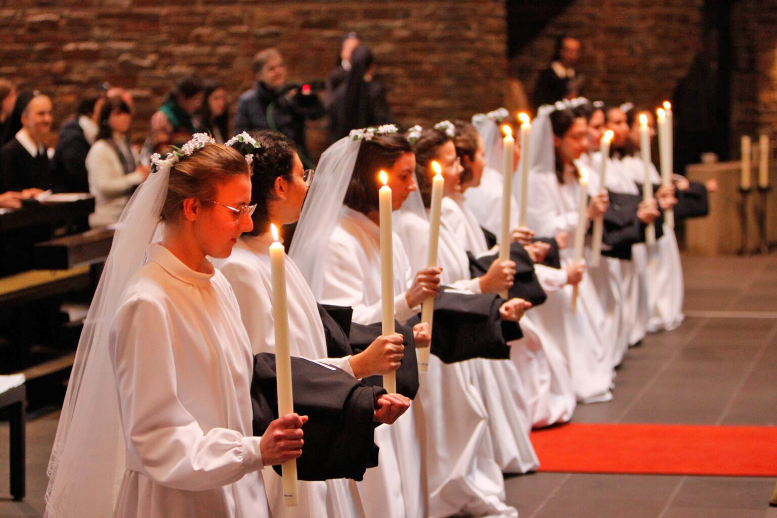 El rito comenzó cuando la Hna. M. Joanna Buckley, Superiora General, llamó a las novicias por sus nuevos nombres. Luego siguió la entrega de vestidos, medallas y velas. Durante el cambio de vestimenta, la ceremonia continuó con cantos y oraciones. Hermanas de sus países de origen llevaron azucenas ante la imagen de la Virgen.