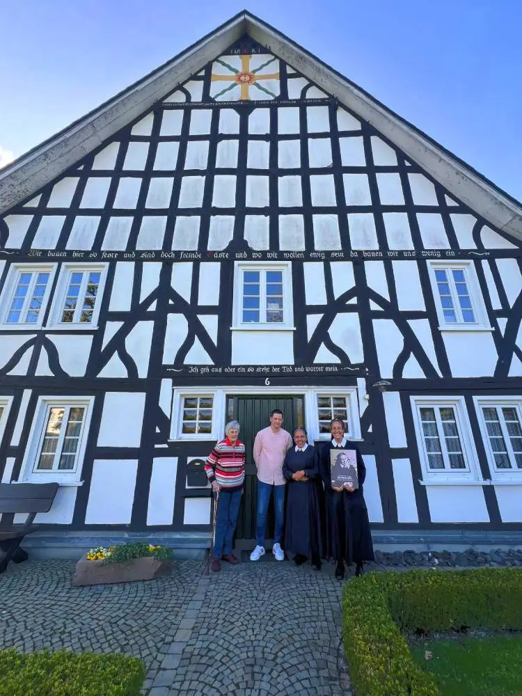 From Schoenstatt, we made a pilgrimage to Husten, the village where she was born and baptized. We were able to visit her family home, as we had seen it in photos in the book “My Yes is Forever,” and share it with her family. We were welcomed by Michael Engel, Emilie’s great-grandnephew, and his mother Helena, widow of Emilie’s grandnephew. Shortly after, we went to the parish where she spent her childhood. There, we discovered the origin of a daily loyalty, learned in the little things. In the Chapel of the Sacred Heart, which has a relic of Sr. M. Emilie, there is an altar frontal given to her and embroidered by her with the inscription “Heart of Jesus, to you eternal loyalty.” We ended this tour at St. Clement’s Parish in Drolshagen, where she was baptized, and there we renewed our baptismal covenant.